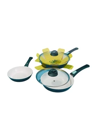3 Pfannen: 1x 20 cm, 1x 24 cm und 1x 28 cm Durchmesser, 2 Glasdeckel: 1x 24 cm und 1x 28 cm Durchmesser, 2x Pfannenschutz