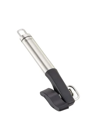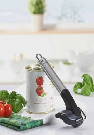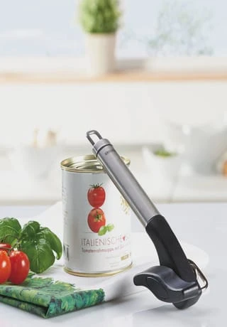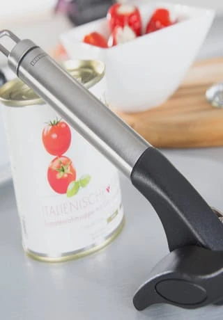 Keine scharfen Kanten und kein Deckel, der in den Doseninhalt fällt: Der Dosenöffner ProLineSafety wird wie herkömmliche Dosenöffner von oben auf die Dose aufgesetzt, rastet von selbst ein schneidet den Deckel aber seitlich ab statt von oben. So kann der gesamte Deckel abgenommen und später wieder aufgesetzt werden. Es entstehen keine scharfen Schnittkanten und der oft unsaubere Deckel kommt nicht mit dem Doseninhalt in Berührung. Weiterer Vorteil: Der Dosenöffner besitzt nur einen Griff. Der liegt angenehm in der Hand und lässt sich aufgrund seiner ovalen Form gut und sicher halten. Gelungen ist auch die Optik. Schick, schlicht und elegant so präsentiert sich der Leifheit Küchenhelfer aus der Serie ProLine in seiner hochwertigen Verbindung von Edelstahl und schwarzem Kunststoff.
