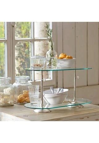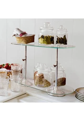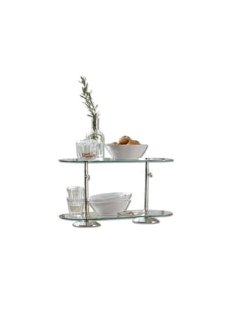 Zwei Ebenen – gehalten von einem höhenverstellbaren Messinggestell. Die zwei gläsernen Böden der Etagere schaffen stilvoll Platz auf Anrichte oder Esstisch. Das Beste: Das höhenverstellbare Gestell aus silberfarbenem Messing. Toll für die Präsentation von Süßem, Gebäck oder all Ihrer kreativen Deko-Ideen.