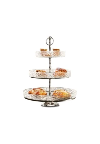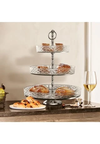 Platten aus Glas mit zarter Rautenschliff-Gravur. Zauberhaftes Vintage-Flair und ein Modell, das wie ein Erbstück oder ein feiner Flohmarkt-Fund wirkt. Aus klarem Glas mit zarter Rautenschliff-Gravur und kunstvoll verziertem Eisen entstand das schöne Design. Der Tragering oben sorgt dafür, dass es leicht zu platzieren ist. Befüllen Sie es beispielsweise mit süßen oder würzigen Leckereien, Obst und Gemüse oder auch rein dekorativen Artikeln. Ob Duftkerzen und Blüten, Äpfel und Orangen oder Fenchel, Tomaten und Knoblauchzehen – dieses hübsche Modell ist sehr vielseitig nutzbar. Zum Abendessen oder Snack am Nachmittag könnten Sie Antipasti, Oliven und Käse darauf servieren. Und zur Teeparty oder dem gemütlichen Frühstück am Wochenende finden Croissants, Muffins und Konfitüre-Gläschen hier einen stilvollen Platz. Ein echtes Highlight auf jeder Tafel. Auch wenn Gäste zum Dinner oder einem Fest kommen, ist es ein sehr stilvoller Akzent auf dem gedeckten Tisch. Hochwertige Eleganz für Liebhaber antik wirkender Details.