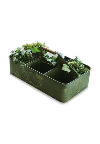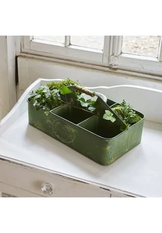 Nostalgischer Shabby-Chic aus Eisen und Tragegriff aus Tannenholz. Eine feine Kranz-Prägung sorgt für noch mehr Charme. Dank sechs Fächern sehr flexibel nutzbar. Ein romantisches Accessoire, das alle Freunde des Shabby-Chics entzücken dürfte. Das handliche Tablett lässt sich sehr vielseitig nutzen: Stellen Sie kleine Pflanztöpfchen mit Blüten oder Kräutern hinein oder nutzen Sie es, um Gläser ganz bequem zu transportieren – vielleicht ja für ein Frühlings-Picknick. Auch zur Aufbewahrung lässt es sich wunderbar verwenden, beispielsweise für kleine Accessoires wie Haarspangen oder Knöpfe. Zudem sieht es einfach wunderschön aus und ist ein sehr gekonnter Deko-Akzent.