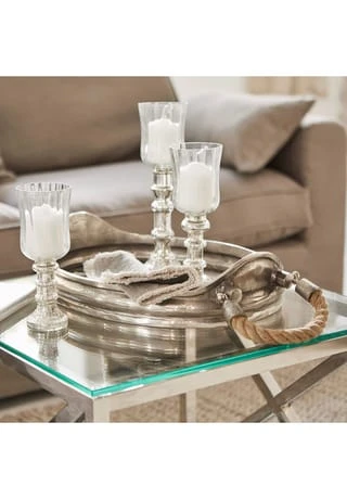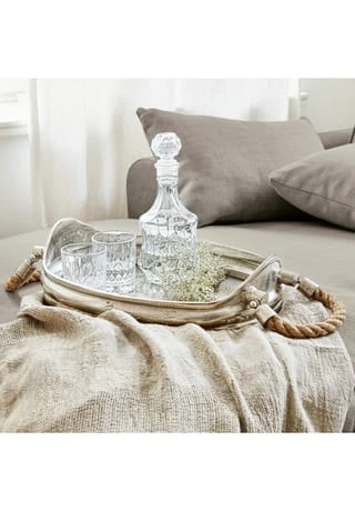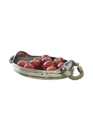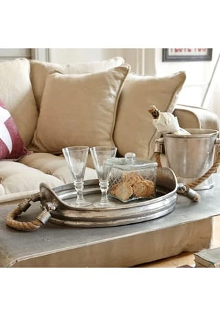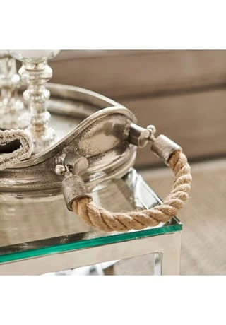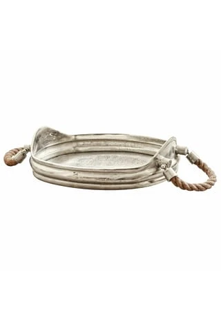 In eleganter Antiksilber-Optik aus Aluminiumguss mit rustikalen Jutegriffen. Der außergewöhnliche Material-Mix macht es zu einem echten Highlight. Durch den etwas höher gezogenen Rand lässt es sich auch wunderschön für all Ihre Deko-Ideen einsetzen.