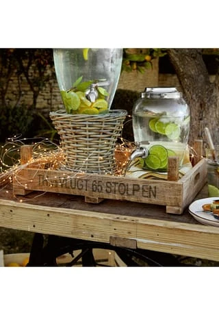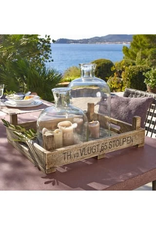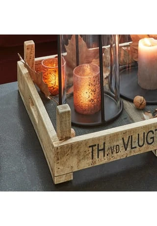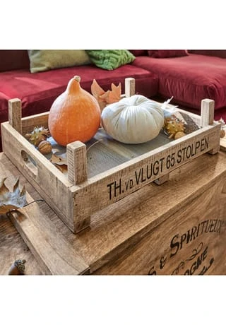 Mit Gitterboden und Brandprint: ein feiner, nostalgischer Blickfang. Das Tablett bietet einen charmanten, lebendigen Vintage Style für nahezu jeden Winkel im Haus oder Garten. Es ist ganz schlicht, nach dem Vorbild alter Obststiegen, gearbeitet. Dabei besteht es nicht wie früher üblich aus Fichtenholz, sondern aus sehr wetterfestem Mangoholz. Ihr Boden besteht aus einem Eisengitter. Dadurch ist es nicht für schwere Lasten, wie Geschirr geeignet, ist aber beim Dekorieren umso vielfältiger nutzbar. Wenn Sie dieses Tablett gegen eine Wand lehnen, oder gegen einen anderen Gegenstand Ihrer Wahl, dann verbinden Sie beide zu einem wunderbar harmonischen Gesamtwerk. Der Blick gleitet durch das Gitter und lässt eine optische Verbindung mit dem Hintergrund zu. Es gibt so viele schöne Vintage Ideen, lassen Sie Ihre Gedanken reisen. Im Außenbereich könnten ein paar Wurzelstücke auf dem Tablett spannende Akzente setzen. Sie können es auch als säumenden Untersatz der Windlichter verwenden. Ihre Fantasie ist der erste Schritt zu unzähligen Dekoideen, natürlich auch im Haus. Wir dieses Tablett dauerhaft im Außenbereich genutzt, dann kann das Eisen anfangen zu korrodieren. Mehr Vintage geht wirklich nicht. Wenn Sie da korrodieren vermeiden wollen, sollte das Eisen vor dem Außeneinsatz mit Klarlack vor Feuchtigkeit geschützt werden.