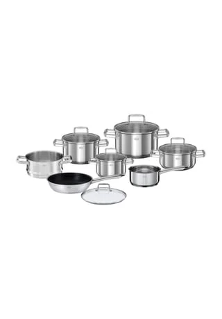 3x Kochtopf mit Glasdeckel Ø 16 cm/ 20 cm/ 24 cm, 1x Bratentopf mit Glasdeckel Ø 20 cm, 1x Dämpfeinsatz Ø 20 cm, 1x Stielkasserolle Ø 16 cm, 1x Bratpfanne mit Glasdeckel Ø 28 cm