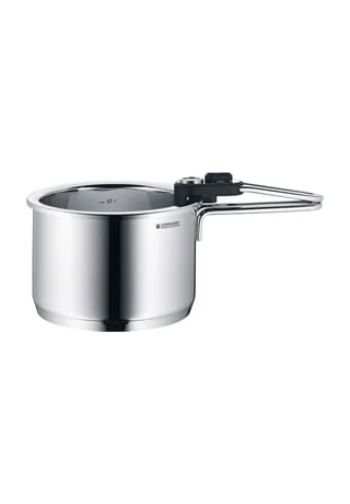 Manche Zutaten neigen beim Erhitzen in normalen Töpfen zum Überkochen oder gar zum Anbrennen. Nicht so im Simmertopf von WMF, denn dieser arbeitet nach dem Prinzip des Wasserbads, bei dem eine Schicht Wasser den eigentlichen Topf vom entnehmbaren Einsatz trennt. Milch erwärmen, Pudding zubereiten, Schokolade schmelzen, Brandteig herstellen, Tiefgekühltes auftauen: Der Simmertopf meistert diese Aufgaben mühelos, ohne dass etwas überkocht oder gar anbrennt. Mittels eines integrierten Thermometers ist die Hitze im Einsatz bis zu 100 °C einfach kontrollierbar, eine praktische Innenskalierung macht das Abmessen von Flüssigkeiten zum Kinderspiel und über den ausgestellten Schüttrand klappt das Ausgießen tropffrei. Der energiesparende TransTherm® Allherdboden ermöglicht den Einsatz des Simmertopfs auf jedem Herd – inklusive Induktion. Topf und Einsatz sind aus hochwertigem Cromargan® Edelstahl rostfrei 18/10 gefertigt und dürfen zur komfortablen Reinigung in die Spülmaschine.