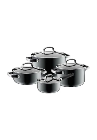 1x Stielkasserole mit Deckel Ø 16 cm, 1x Bratentopf mit Deckel Ø 20 cm 2,4 l, 1x Fleischtopf mit Deckel Ø 20 cm, 3,7 l, 1x Fleischtopf mit Deckel Ø 24 cm 6,4 l